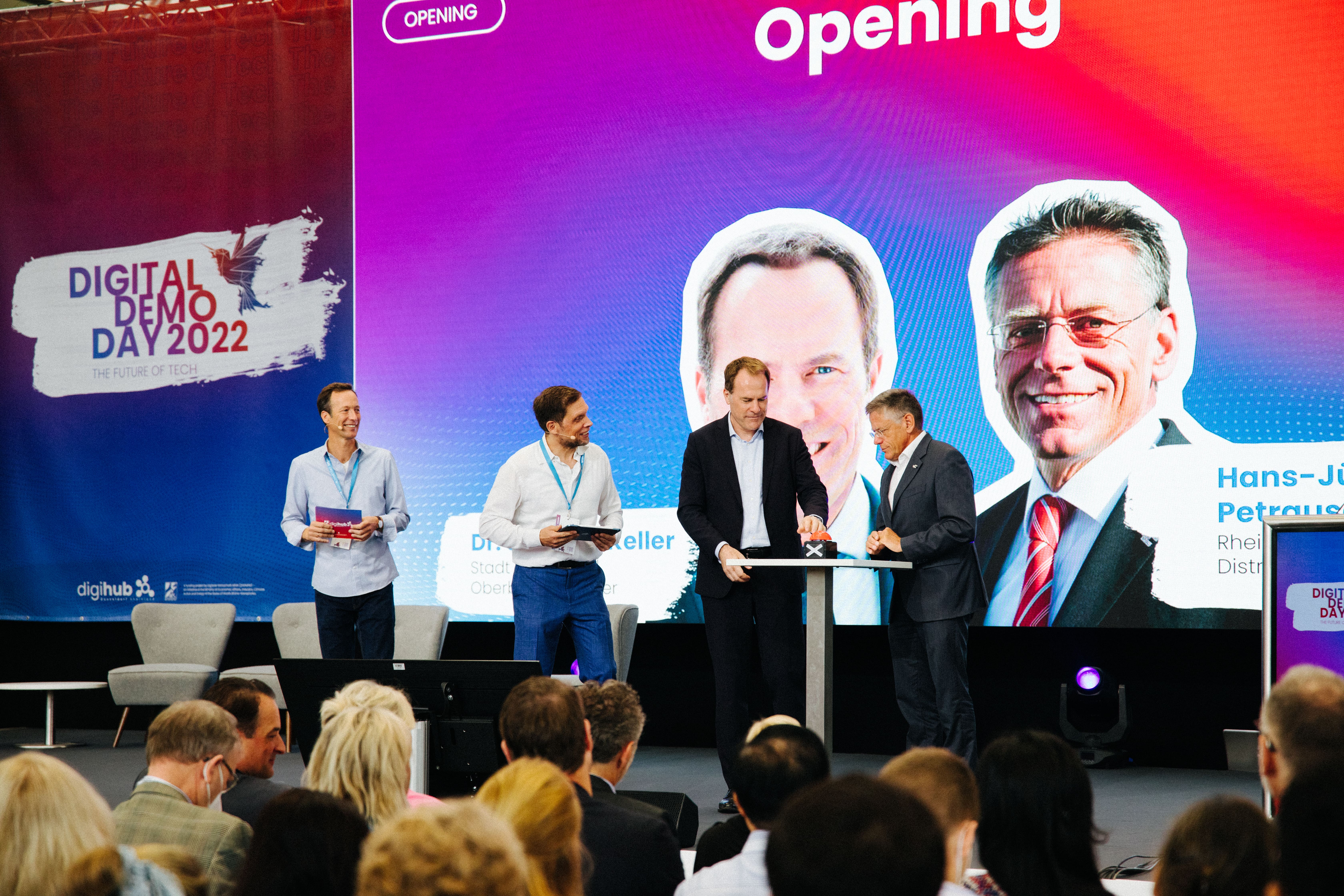 Eröffnet wurde die Digital Demo Day Main Stage um 10 Uhr von den digihub Geschäftsführern Dr. Klemens Gaida und Peter Hornik. Das erste Highlight folgte mit den Eröffnungsworten von Oberbürgermeister Dr. Stephan Keller, Landrat Rhein-Kreis Neuss Hans-Jürgen Petrauschke, NRW-Ministerpräsident Hendrik Wüst und Dr. Anna Christmann des Bundesministeriums für Wirtschaft und Klimaschutz, die uns Tech Startups als Innovationstreiber für Klimaschutz näher gebracht hat. Es war uns eine Ehre!